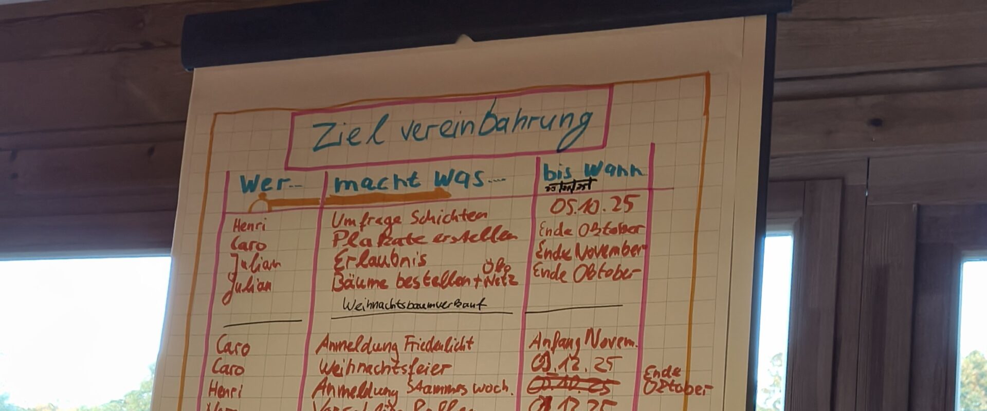 Am Samstag haben wir uns vor allem Gedanken darüber gemacht, was wir für Aktionen im nächsten Jahr machen wollen. Wir wollen in diesem Jahr wieder Weihnachtsbäume verkaufen und das Friedenslicht am 3. Advent abholen. Im nächsten Jahr wollen wir wieder vom 23. – 25. Januar ein Stammeswochenende in der Nähe von Bielefeld machen. Wir wollen auch wieder ins Pfingstlager und ins Sommerlager fahren.